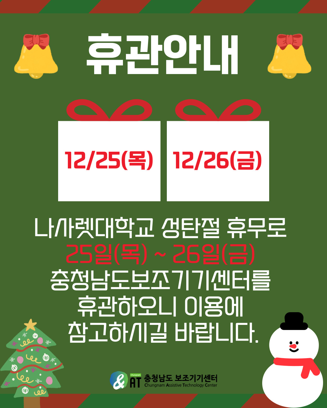 나사렛대학교 성탄절 휴무로 충청남도보조기기센터를 휴관하오니 이용에 참고하시길 바랍니다.